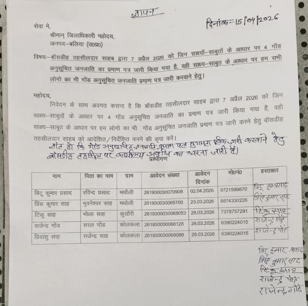 बलिया। 15 अप्रैल 2026 को बांसडीह तहसीलदार द्वारा 7 अप्रैल 2026 को चार गोंड समुदाय के लोगों को अनुसूचित जनजाति प्रमाण पत्र जारी किए जाने के बाद अब पूरे गोंड समाज के लिए समान प्रक्रिया अपनाने की मांग तेज हो गई है। इसी क्रम में ऑल गोंडवाना स्टूडेंट्स एसोसिएशन (आगसा) के तत्वावधान में जिलाधिकारी एवं नगर मजिस्ट्रेट को ज्ञापन सौंपा गया।