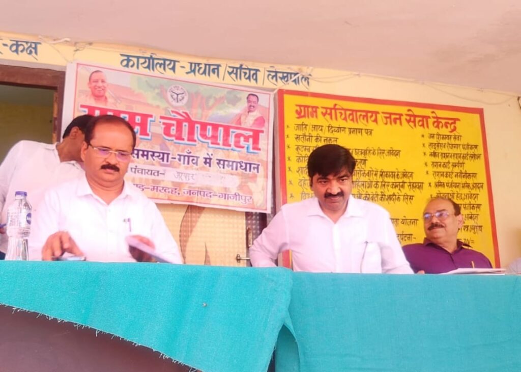 गाजीपुर। मरदह सरकार की जन कल्याणकारी योजनाओं का लाभ जन-जन तक पहुंचाने के लिए आयोजित हुआ शुक्रवार को ग्राम चौपाल लगाकर ग्रामीणों की समस्याओं का समाधान गांव में किया गया।सुशासन सप्ताह के तहत प्रशासन चला गांव की ओर के उद्देश्य से गांव की समस्या,गांव में समाधान के लिए ग्राम चौपाल का आयोजन किया गया।