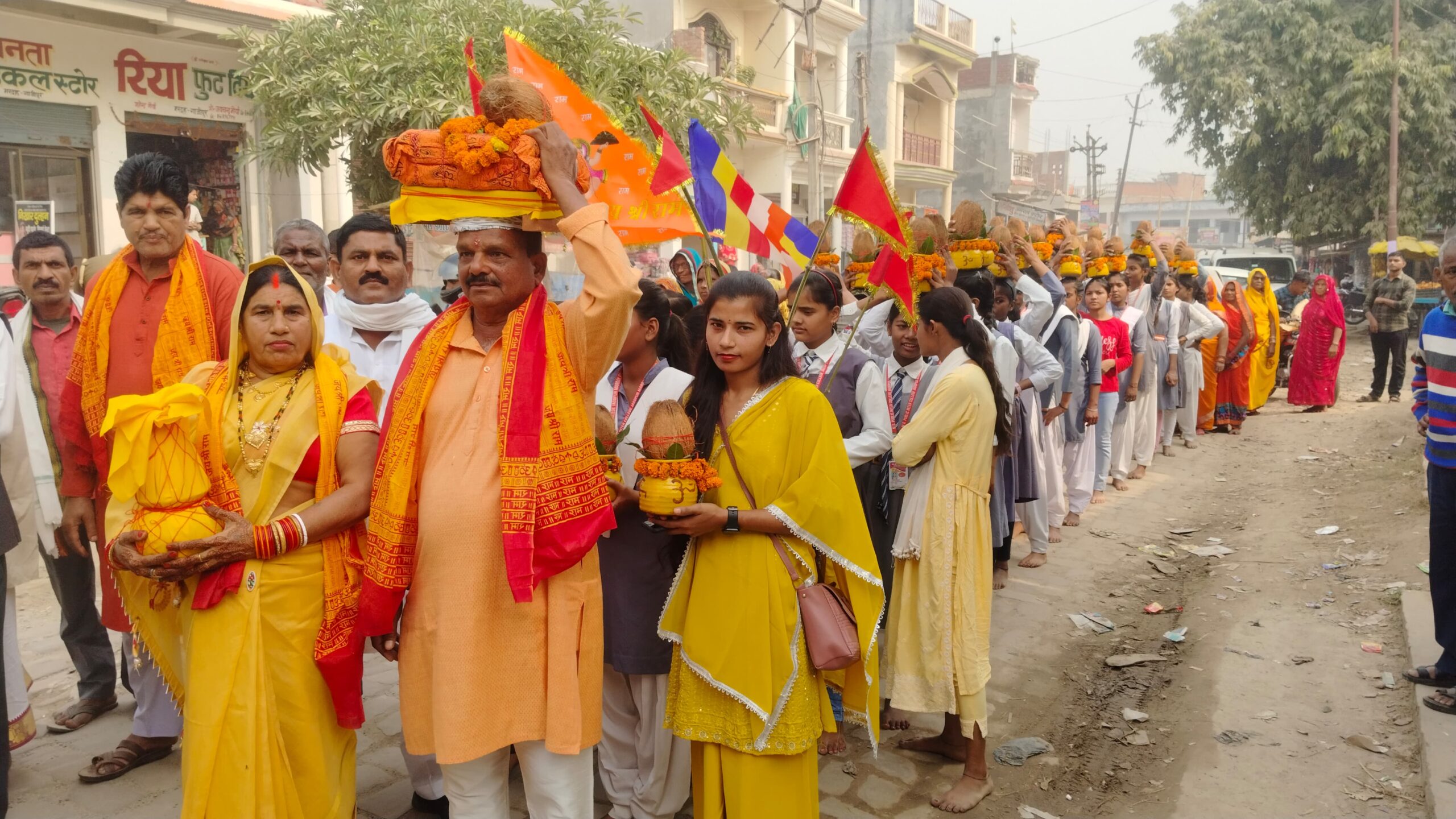 मरदह: आस्थावान भक्तों ने नंगे पैर पांच किलोमीटर लम्बी दूरी तक कलश शोभायात्रा निकली। भक्तों के उद्घोष से पूरा वातावरण भक्तिमय बना रहा। माथे पर कलश लेकर महिलाएं व युवतियां तथा पुरूष के साथ बाजे गाजे के साथ जब यात्रा निकली तो इसकी शोभा देखते बन रही थी। जिधर से कलश-यात्रा निकलती भक्त हर्षोल्लास के साथ जय-जयकार करते नजर आए। जिससे वातावरण देवमय हो जा रहा था ऐसा लगता मानो धरती पर स्वर्ग उतर आया हो।