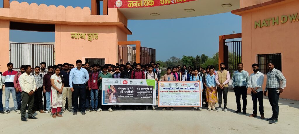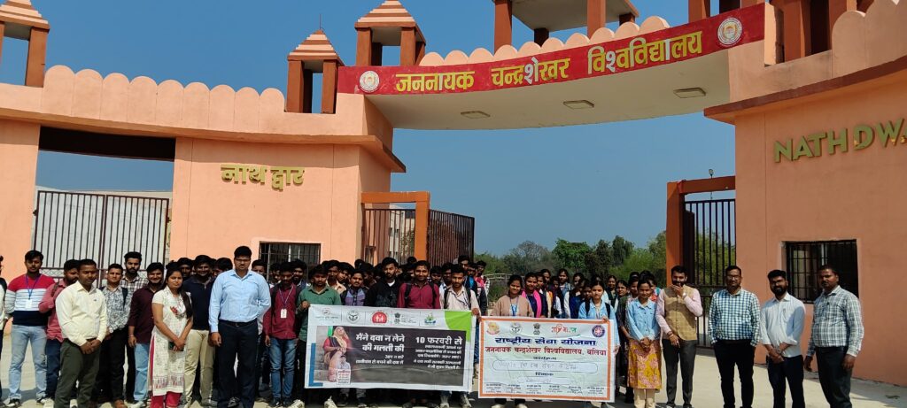 बलिया । जननायक चंद्रशेखर विश्वविद्यालय में राष्ट्रीय सेवा योजना (एनएसएस) के अंतर्गत फाइलेरिया जागरूकता रैली का सफल आयोजन किया गया। यह कार्यक्रम विश्वविद्यालय के माननीय कुलपति प्रो. संजीत कुमार गुप्ता के संरक्षण एवं निर्देशन में संपन्न हुआ।रैली का आयोजन एनएसएस परिसर इकाई यूनिट–1 एवं यूनिट–2 के तत्वावधान में किया गया। कार्यक्रम में विश्वविद्यालय के छात्र-छात्राओं, शिक्षकगण तथा एनएसएस स्वयंसेवकों ने उत्साहपूर्वक भाग लिया।