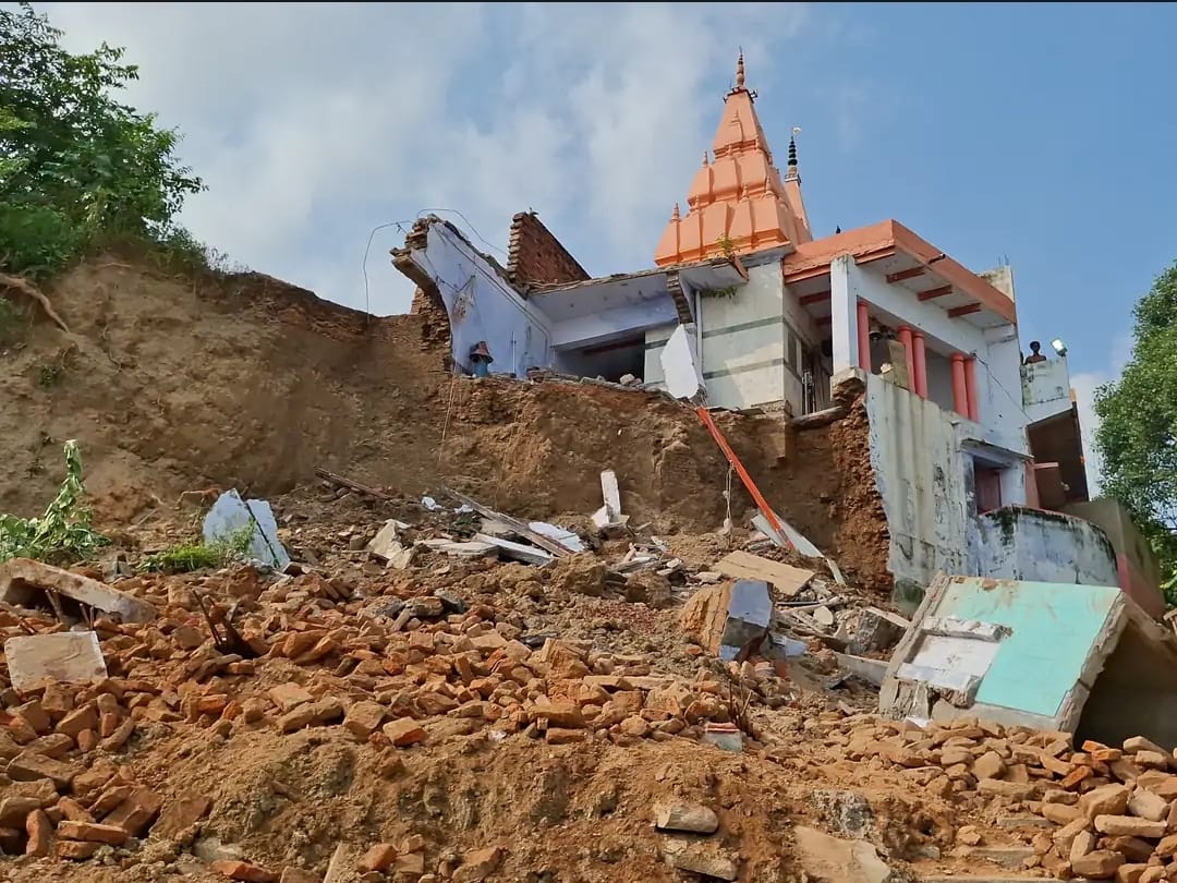लगातार तीन दिनों से जारी बारिश के चलते मंदिर के नीचे की मिट्टी कट गई थी। बताया जा रहा है कि रात करीब 9:30 बजे मंदिर का आधा ढांचा अचानक भरभराकर गिर पड़ा। हादसे के बाद का दृश्य बेहद भयावह था — मंदिर का एक हिस्सा अब गंगा की तेज धारा तक पहुँच गया है।