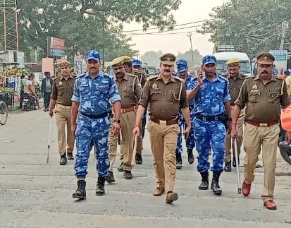 गाजीपुर: कानून व्यवस्था तथा आम जनमानस में शांति एवं सौहार्दपूर्ण माहौल बनाए रखने के के दृष्टिगत जनपदीय पुलिस की थाना गहमर की पुलिस फोर्स व आर.ए.एफ. पैरामिलिट्री फोर्स के द्वारा मिश्रित आबादी एवं भीड़-भाड़ वाले स्थानों, चौराहों आदि जगहों मे एरिया डॉमिनेशन/रूट मार्च किया। इस दौरान पुलिस ने आमजनमस को शांति एवं सुरक्षा का एहसास कराया।