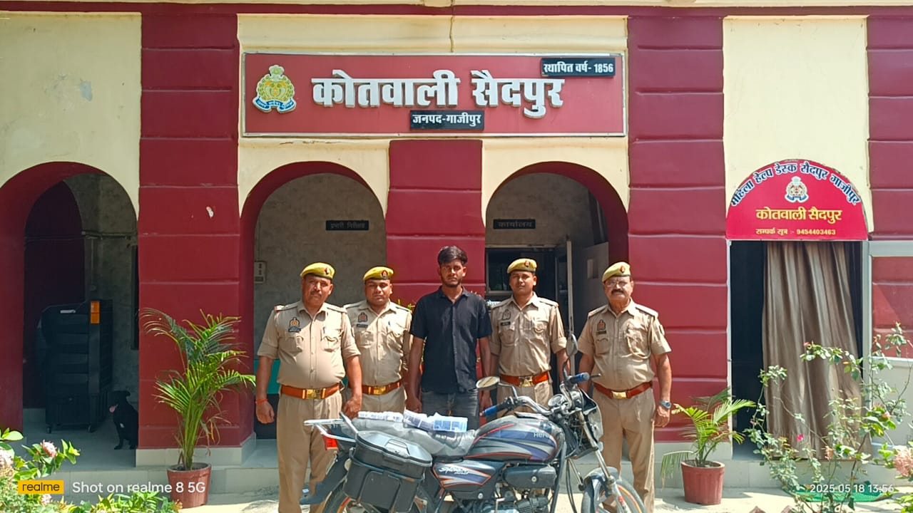 यह वही सचिन है, जो अपने गुर्गों के साथ मिलकर सैदपुर और सादात में लूट, हमला और गैरकानूनी गतिविधियों को अंजाम दे रहा था। गिरफ्तारी के वक्त बरामद हुआ सामान भी उसकी आपराधिक मानसिकता की पोल खोलता है। गिरफ्तार अभियुक्त का नाम सचिन (20) पुत्र हुकुमचंद , निवासी भद्रसेन, थाना सैदपुर है।