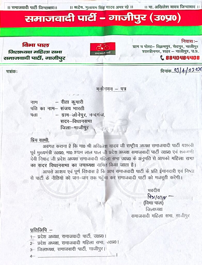 कार्यक्रम के दौरान समाजसेवी एवं अपना समूह (स्वयं सहायता समूह) लोनेपुर की अध्यक्ष श्रीमती रीता देवी को समाजवादी महिला सभा का सदर विधानसभा उपाध्यक्ष नियुक्त किया गया। जिलाध्यक्ष विभा पाल ने उन्हें विधिवत नियुक्ति पत्र सौंपते हुए कहा कि यह नियुक्ति न केवल संगठन के विस्तार की दिशा में महत्वपूर्ण कदम है, बल्कि जमीनी स्तर पर सक्रिय महिलाओं को नेतृत्व में लाने की पार्टी की सोच को भी दर्शाती है। उन्होंने विश्वास जताया कि रीता देवी अपने अनुभव और सक्रियता से संगठन को और अधिक मजबूत करेंगी।