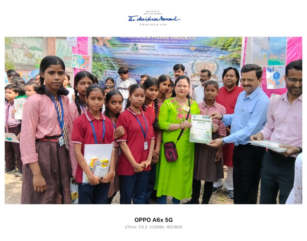 सभी प्रतिभागी बच्चों को संस्था द्वारा प्रमाण पत्र एवं उपहार देकर सम्मानित किया गया।कार्यक्रम में विद्यमा फाउंडेशन का विशेष सहयोग रहा। इसके अलावा दिशा कॉन्वेंट स्कूल, पॉपुलर बाटी चोखा रेस्टोरेंट, सत्यम मंथन एवं USS फाउंडेशन ने भी महत्वपूर्ण योगदान दिया।विशिष्ट अतिथियों के विचारश्रीमती पूजा पांडे (डायरेक्टर, दिशा कॉन्वेंट स्कूल) ने कहा कि “जल ही जीवन का आधार है और बच्चों में जागरूकता लाकर हम सुरक्षित भविष्य का निर्माण कर सकते हैं।”डॉ. विद्यासागर पांडे ने जल संरक्षण को हमारा कर्तव्य बताते हुए कहा कि समय रहते जागरूक होना आवश्यक है।