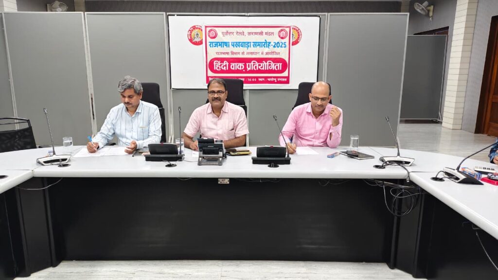 वाराणसी। पूर्वोत्तर रेलवे वाराणसी मंडल के राजभाषा विभाग के तत्वावधान में राजभाषा सप्ताह के अंतर्गत बुधवार को भारतेंदु सभाकक्ष में हिन्दी वाक् प्रतियोगिता का आयोजन किया गया। प्रतियोगिता का विषय था “भारतीय परिवहन प्रणाली में रेलवे का योगदान” और “NPS & UPS”।