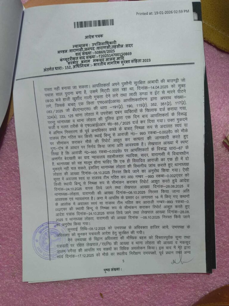 वाराणसी। लोहता थाना क्षेत्र के कोटवा खरका गांव में न्यायालय में विचाराधीन मामले के बावजूद कथित तौर पर प्रशासनिक अनदेखी का मामला सामने आया है। मकसूद आलम पुत्र सरफराज का विवाद अपर सिविल जज की अदालत में विचाराधीन है, वहीं हाई कोर्ट में दाखिल रिवीजन को एसडीएम सदर द्वारा नजरअंदाज किए जाने का आरोप लगाया गया है।