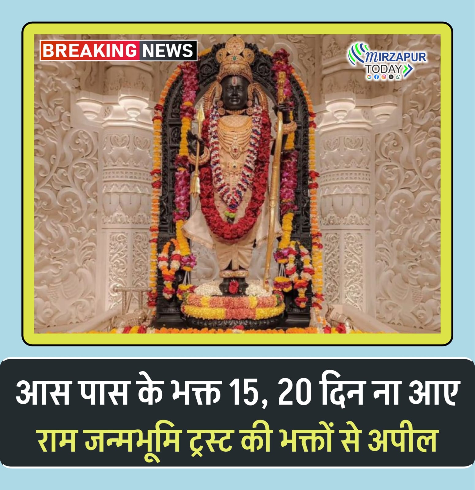 ट्रस्ट की ओर से कहा गया कि हमारा यह निवेदन है कि पास-पड़ोस के भक्तजन 15-20 दिन के पश्चात दर्शन करने अयोध्या पधारें, ताकि बहुत दूर से आने वाले भक्त अभी सुविधा से प्रभु के दर्शन कर सकें।