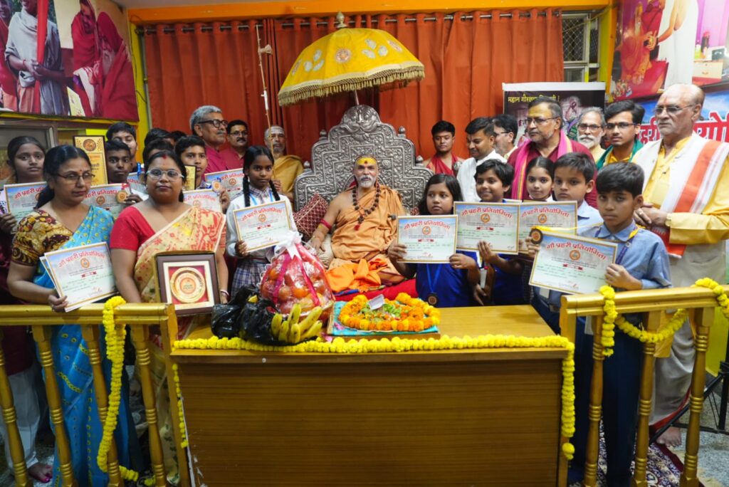 वाराणसी । के श्रीविद्यामठ में आयोजित भव्य समारोह में स्वामी अविमुक्तेश्वरानंद सरस्वती ने गौ प्रहरी प्रतियोगिता के विजेता छात्र-छात्राओं को स्मृति चिन्ह एवं प्रमाणपत्र देकर सम्मानित किया। यह प्रतियोगिता श्रीगुरुकुलम न्यास द्वारा विद्यालय स्तर पर आयोजित की गई थी, जिसमें कक्षा 3 से 12 तक के विद्यार्थियों ने भाग लिया।