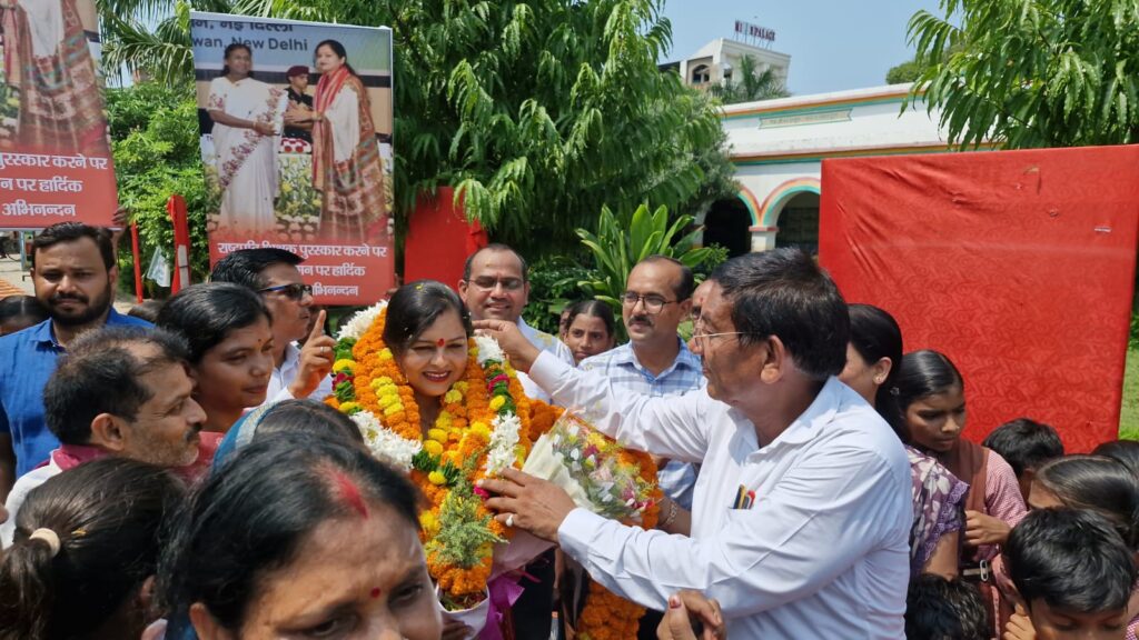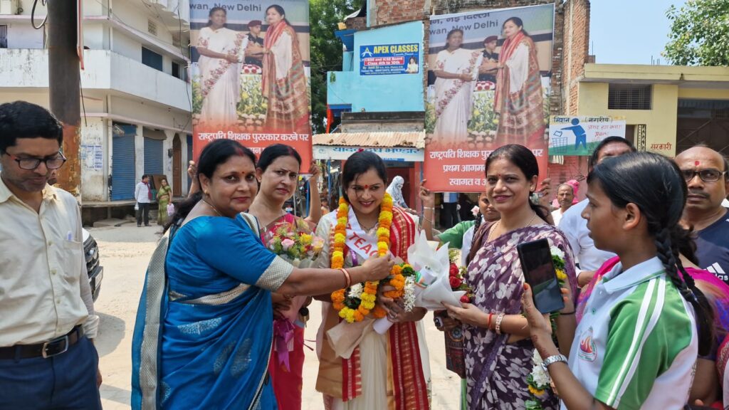 मिर्जापुर: राष्ट्रपति द्रौपदी मुर्मू से राष्ट्रीय शिक्षक पुरस्कार प्राप्त करने के बाद विद्यालय की प्रधानाध्यापिका मधुरिमा तिवारी का विद्यालय पहुंचने पर भव्य स्वागत किया गया। बच्चों और अभिभावकों ने उन्हें नायक की तरह सम्मान दिया। यह क्षण मिर्जापुर ही नहीं बल्कि पूरे उत्तर प्रदेश के लिए गौरवपूर्ण रहा।