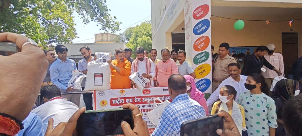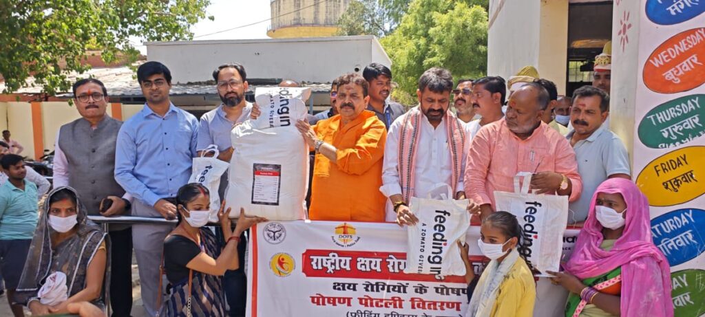 वाराणसी: राष्ट्रीय क्षय रोग उन्मूलन कार्यक्रम के अंतर्गत कम्पोजिट विद्यालय शिवपुर में स्टाम्प, न्यायालय शुल्क एवं पंजीयन मंत्री रवीन्द्र जायसवाल, आयुष मंत्री दयाशंकर मिश्र “दयालु” एवं भाजपा जिला अध्यक्ष हंसराज विश्वकर्मा सहित मुख्य विकास अधिकारी हिमांशु नागपाल की उपस्थिति में मंगलवार को मरीजों को पोषण पोटली का वितरण किया गया। जन प्रतिनिधियों द्वारा जनता से निक्षय मित्र बनकर टीबी मरीजों की मदद करने की अपील की गई।