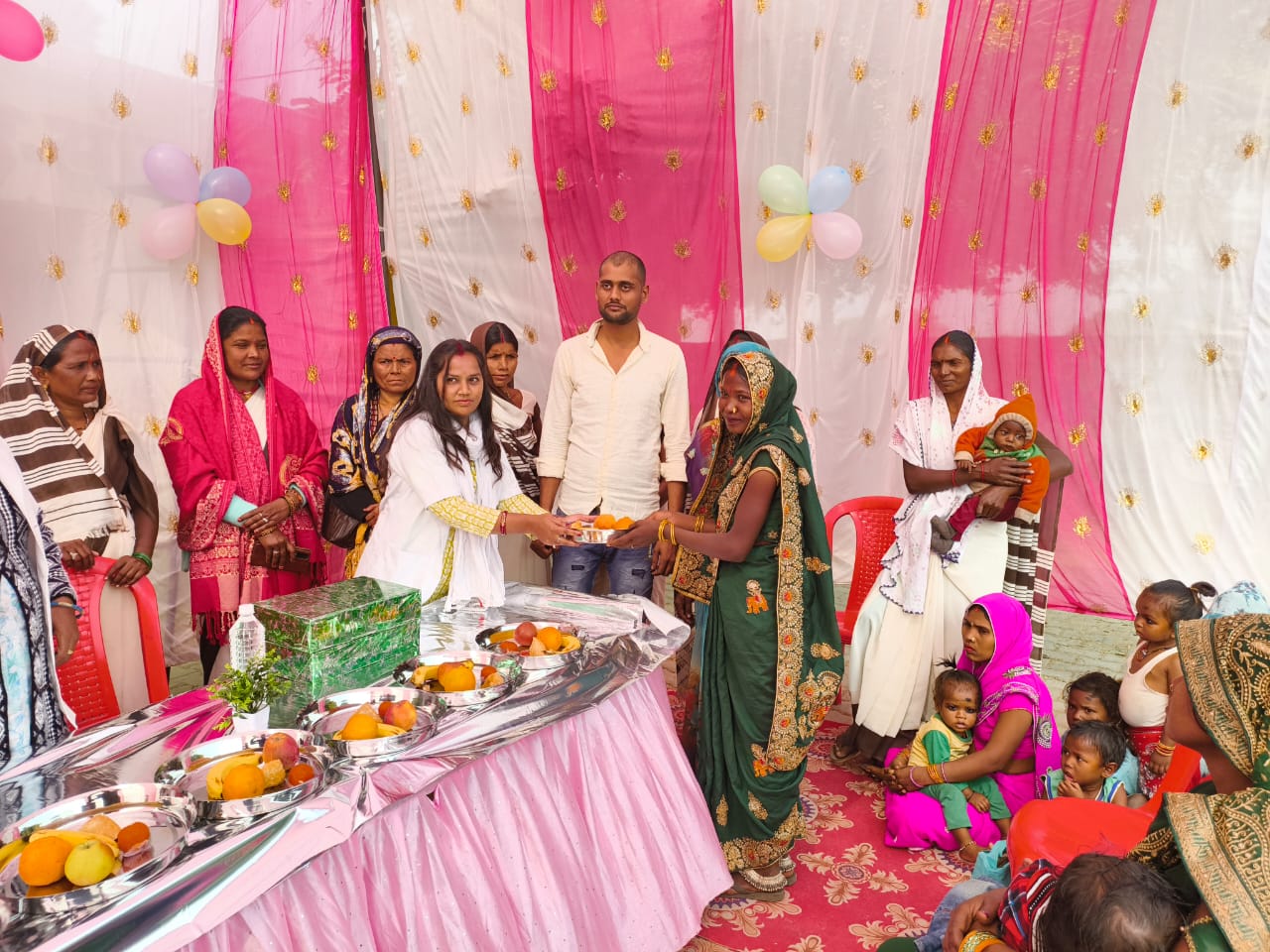 सास-बहू सम्मेलन का किया गया आयोजन, फलों के साथ बाटी गई मिठाई की थाली