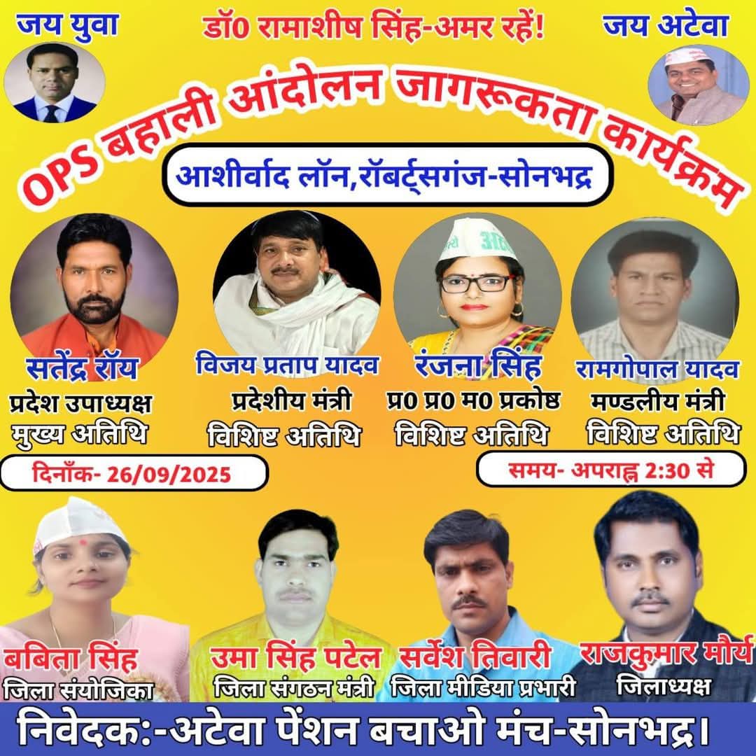 सोनभद्र: पुरानी पेंशन बहाली के लिए आल टीचर्स एंड इम्प्लॉयज वेलफेयर एसोसिएशन (अटेवा) 26 सितंबर को जागरूकता सम्मेलन आयोजित करेगा। कार्यक्रम दोपहर 2:30 बजे रॉबर्ट्सगंज स्थित आशीर्वाद वाटिका में होगा।