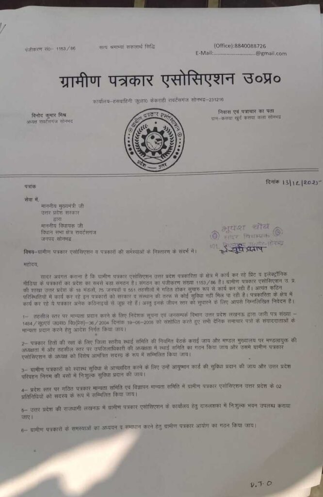 सोनभद्र। ग्रामीण पत्रकार एसोसिएशन उत्तर प्रदेश के सदर तहसील अध्यक्ष विनोद कुमार मिश्र एवं एसोसिएशन के अन्य पत्रकारों ने सदर विधायक रॉबर्ट्सगंज भूपेश चौबे को पत्रकारों के हितार्थ आवश्यक मांगों से संबंधित ज्ञापन सौंपा।