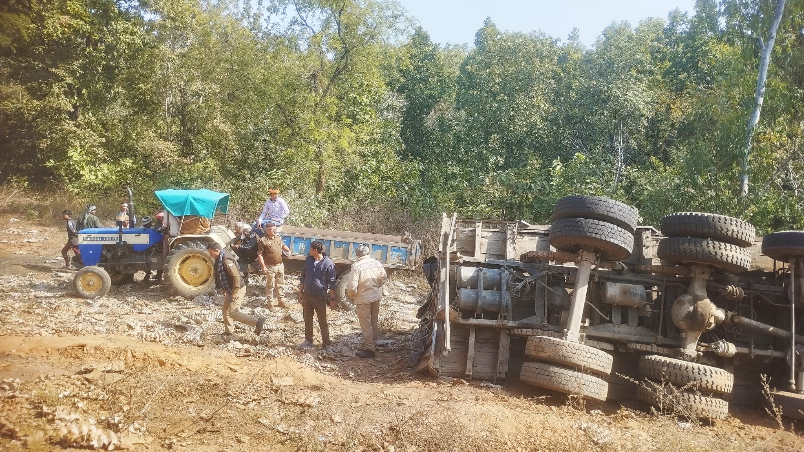 सोनभद्र। कोतवाली दुद्धी क्षेत्र के रजखड़ घाटी में शुक्रवार तड़के एक बड़ा हादसा हो गया। पंजाब से अंग्रेजी शराब लेकर बिहार की ओर जा रहा एक ट्रक अचानक अनियंत्रित होकर सड़क किनारे गड्ढे में पलट गया। घटना की सूचना मिलते ही सीओ राजेश राय, प्रभारी निरीक्षक स्वतंत्र सिंह और कस्बा इंचार्ज हरीकेश राम पुलिस बल के साथ मौके पर पहुंचे।