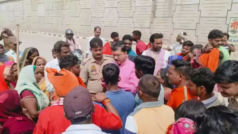 प्रदर्शन के दौरान कैबिनेट मंत्री अनिल राजभर